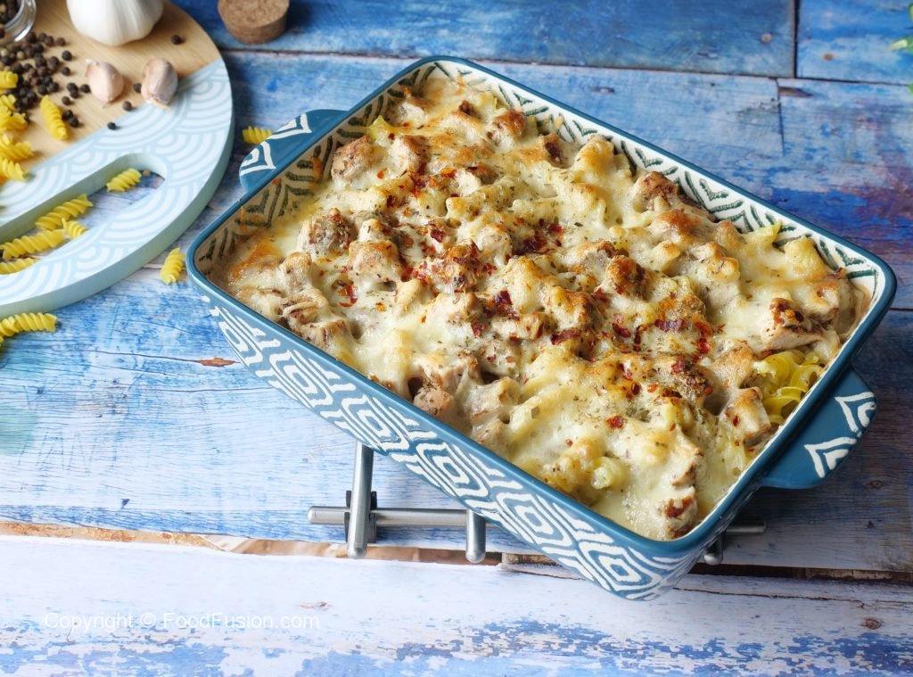 Grease baking dish with oil,add boiled spiral pasta,pour alfredo sauce,add chicken cubes and stir slightly.