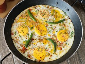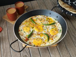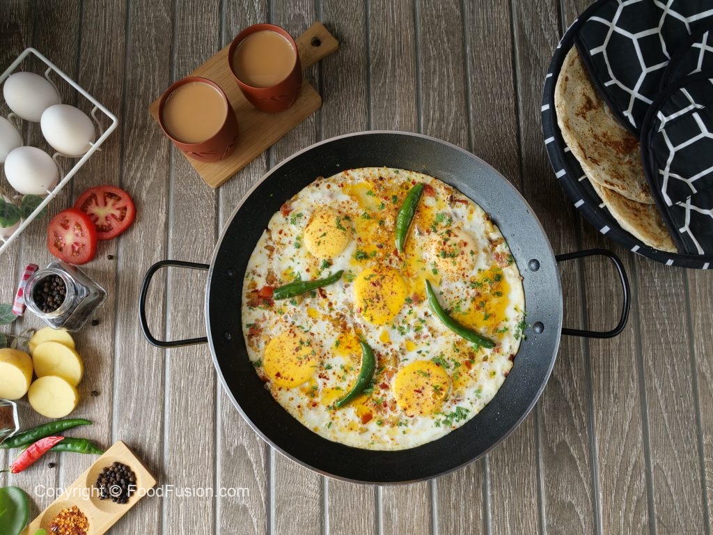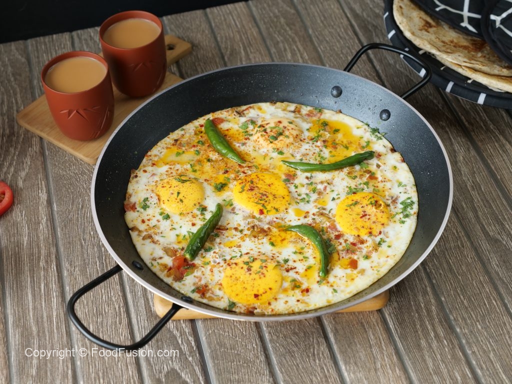-Ek,ek ker ka anday shamil karein,lal mirch crushed aur hari mirchein dal ker dhak dein aur halki ancch per 6-8 minutes kliya paka lein.