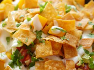 In serving dish,add papri,fresh coriander & serve!