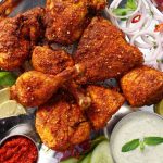 -In a bowl,add yogurt,ginger garlic paste,orange food color,cornflour,prepared spice mix (reserve 1 & ½ tbs for later use),soy sauce,chilli sauce,lemon juice & mix well.