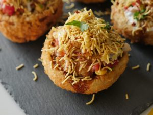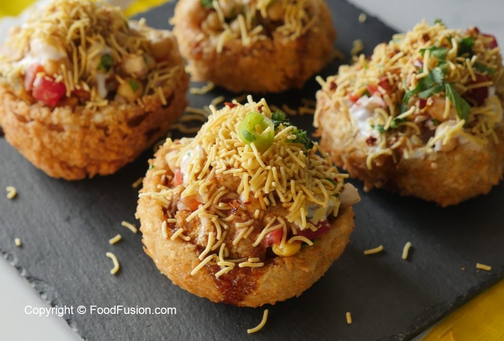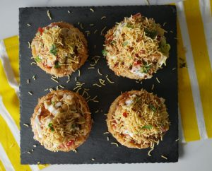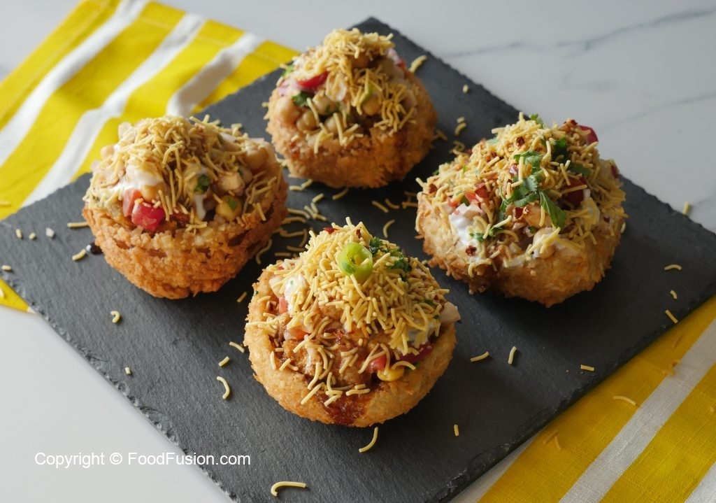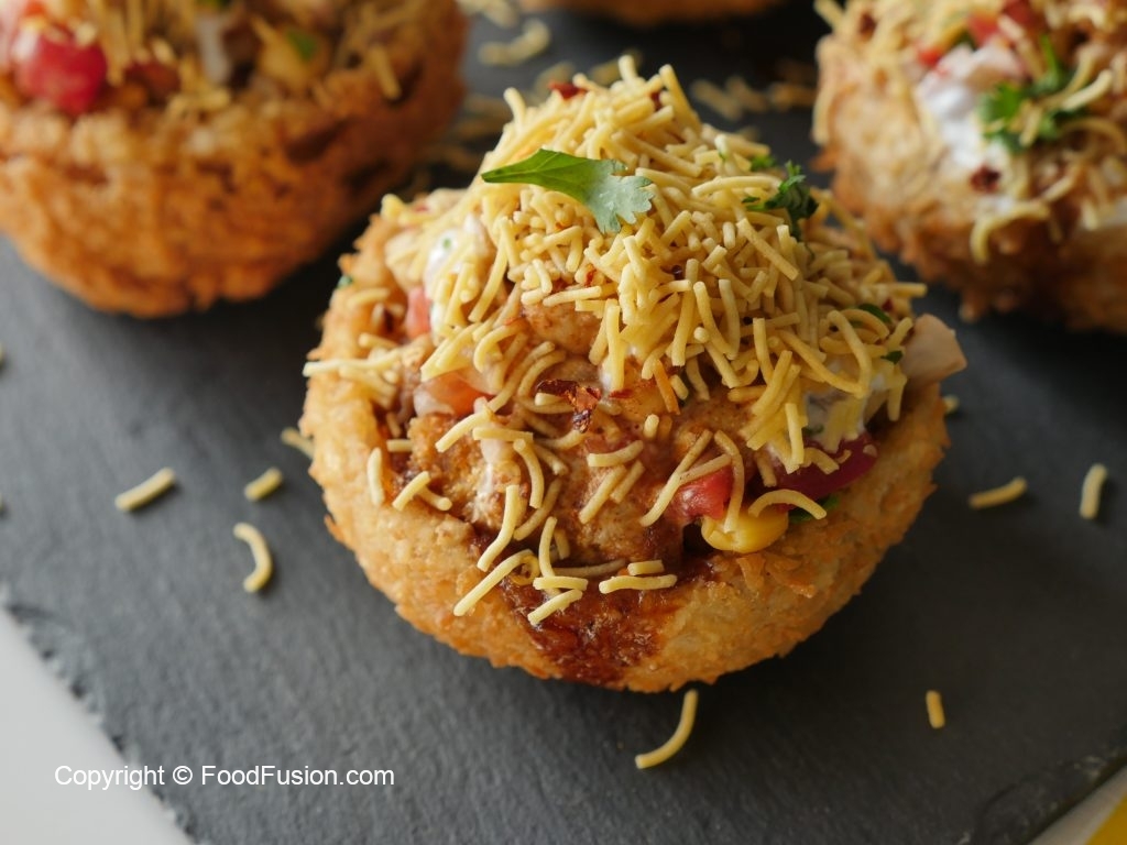 Onion cup mein aloo tikki pieces,chanay ka mixture,dahi,khatti meethi chutney,nimco sev,lal mirch crushed aur hara dhania dal ker serve karein.