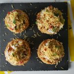 On onion cup,add aloo tikki pieces,chickpeas mixture,yogurt,khatti meethi chutney,nimco sev,red chilli crushed,fresh coriander & serve!