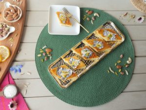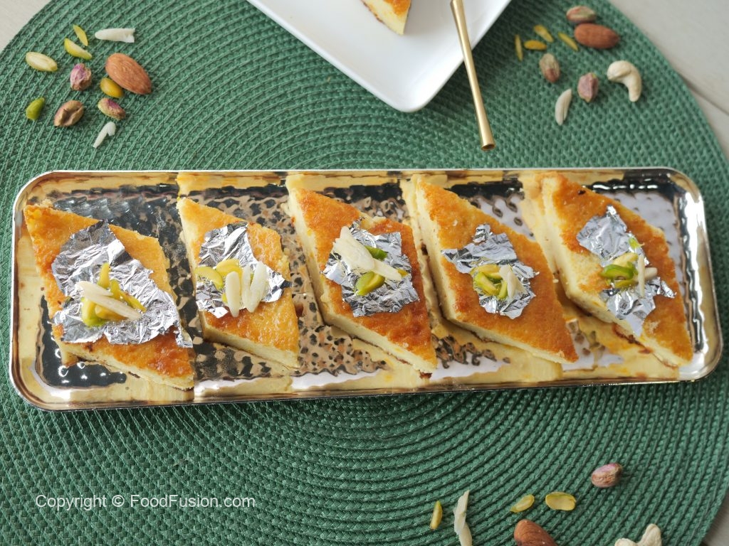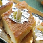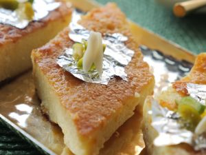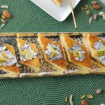 -Cut into diamond shape and garnish with silver leaves,pistachios,almonds & serve!