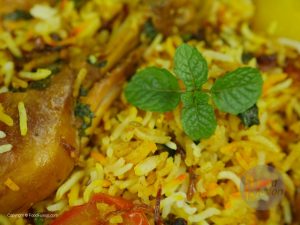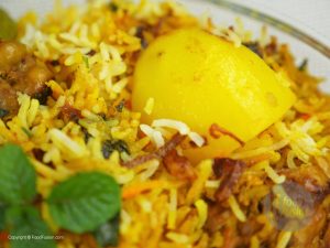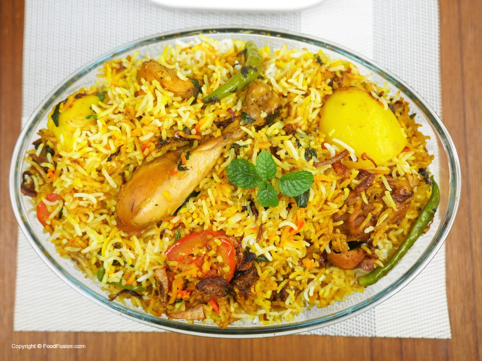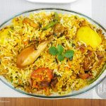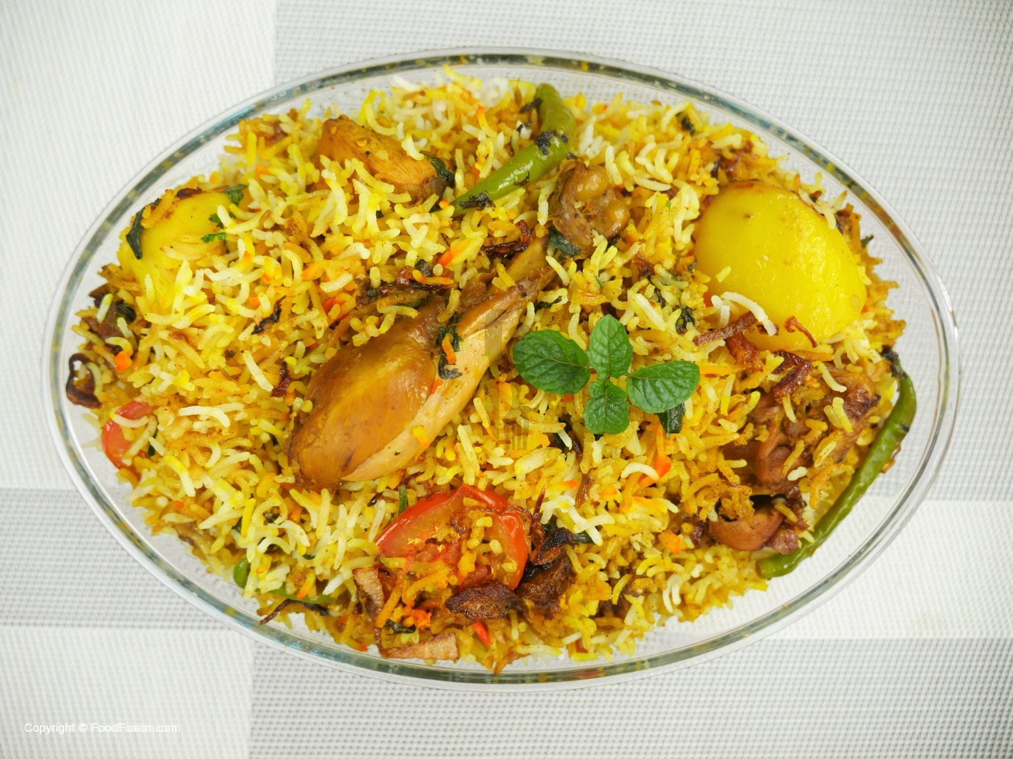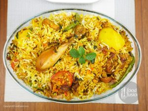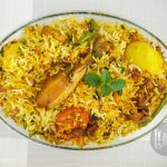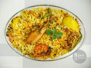 In gravy,add fried onion,tomato (sliced),mint leaves,green coriander,green chili,yogurt,food color,boiled rice,food color,fried onion,mint,green coriander,potatoes (boiled),cover and cook on low flame for 10-12 minutes.
