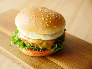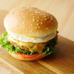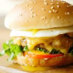 On burger bun,spread mayonnaise,add tomato,lettuce leaf,burger patty,caramelized onion,fried egg and cover with the top bun.
