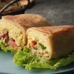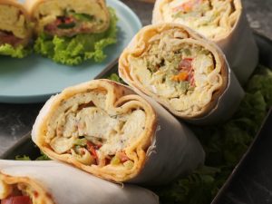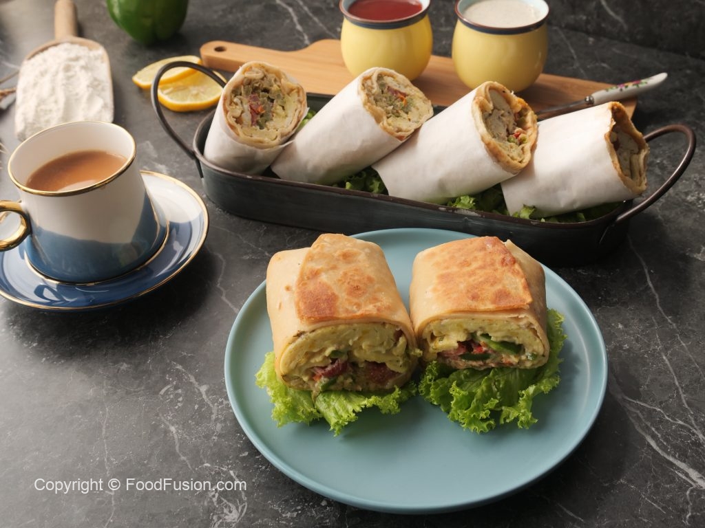 On a clean working surface,place a tortilla,add prepared sour cream sauce,scrambled egg,sauteed vegetables,iceberg,prepared sour cream sauce,hot sauce,fold all the sides & roll the tortilla.