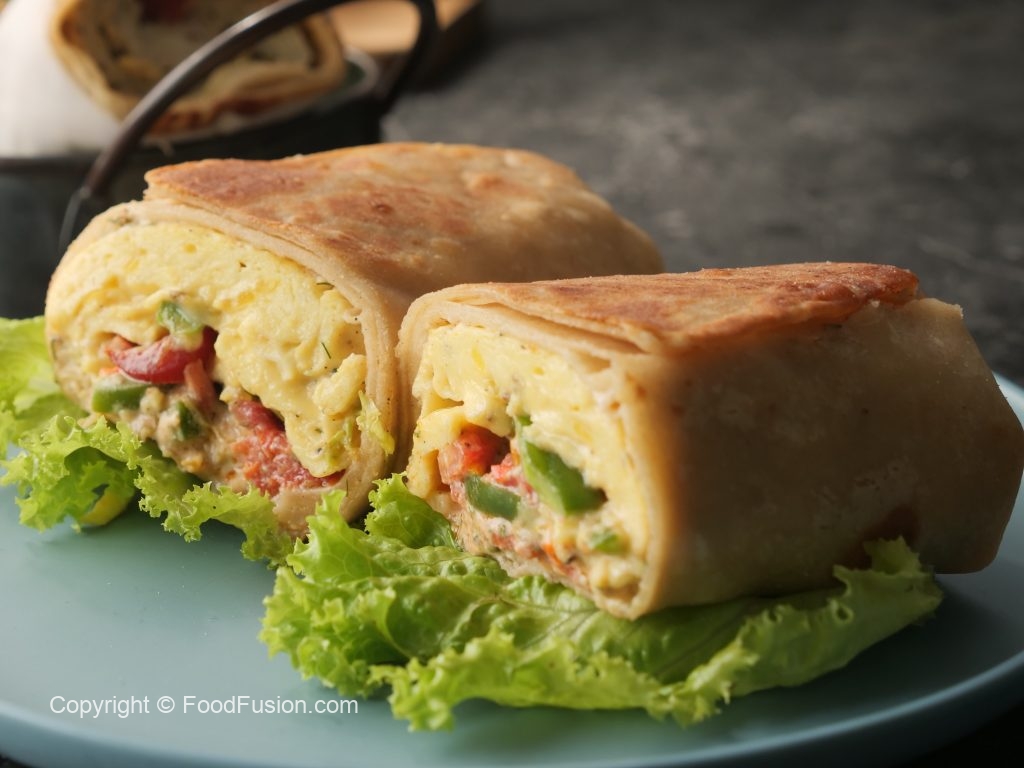 In a frying pan,add cooking oil,whisked eggs & cook on low flame while gently stir in between (makes for 1 burrito).
