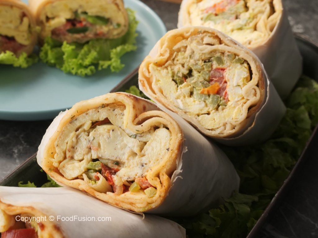 Clean working surface per tortilla rakh dein,tayyar sour cream sauce,scrambled eggs,sauteed vegetables,iceberg,tayyar sour cream sauce aur hot sauce dal dein,sides ko fold karein aur tortilla ko roll ker lein.