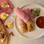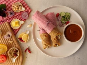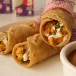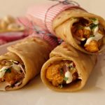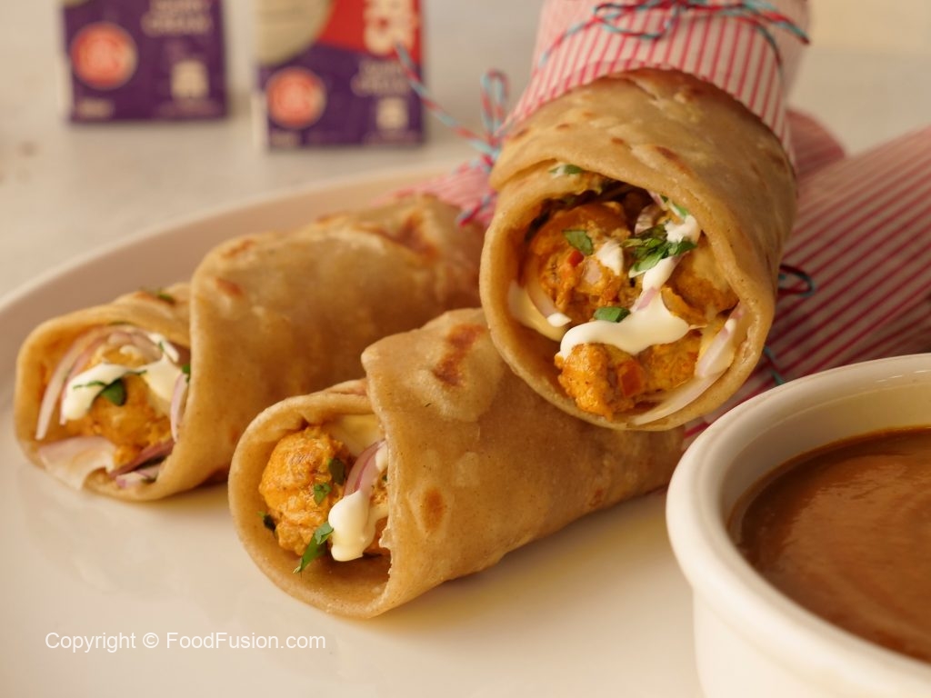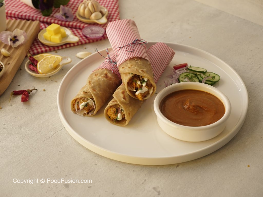 Paratha per butter chicken,pyaz,hara dhania aur cream dal dein,roll ker ka butter paper mein wrap ker lein aur chutney ka saath serve karein (makes 6).