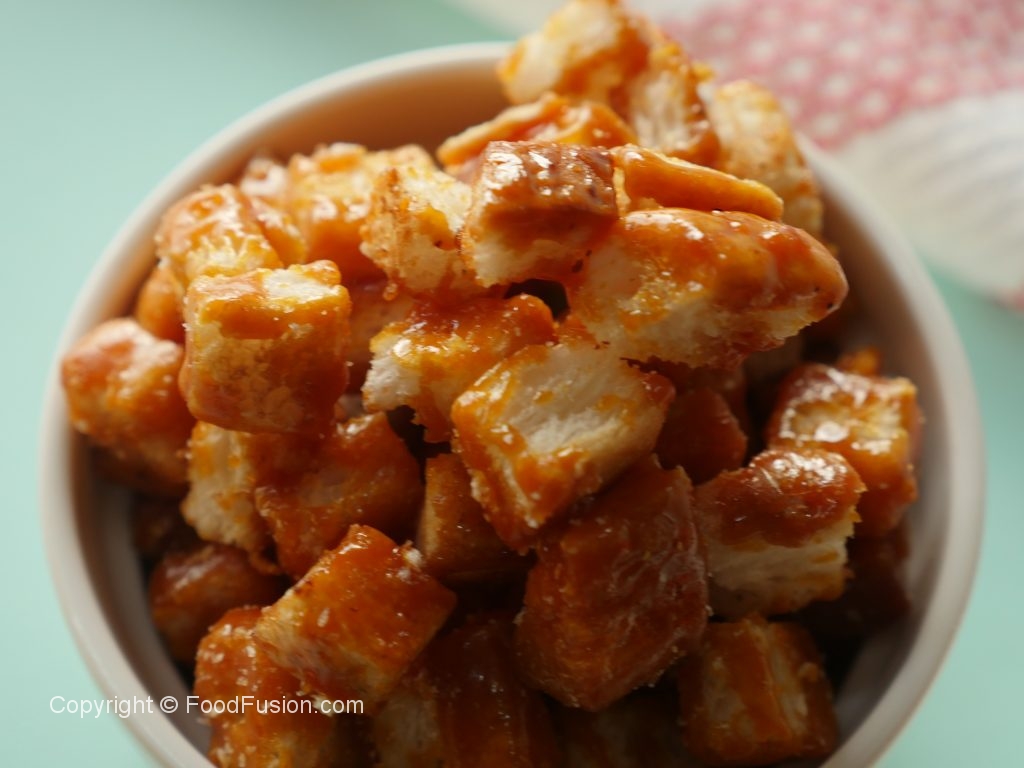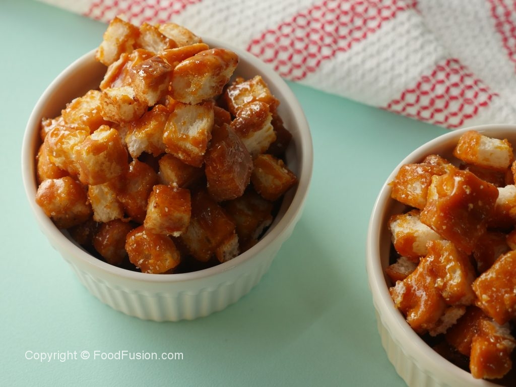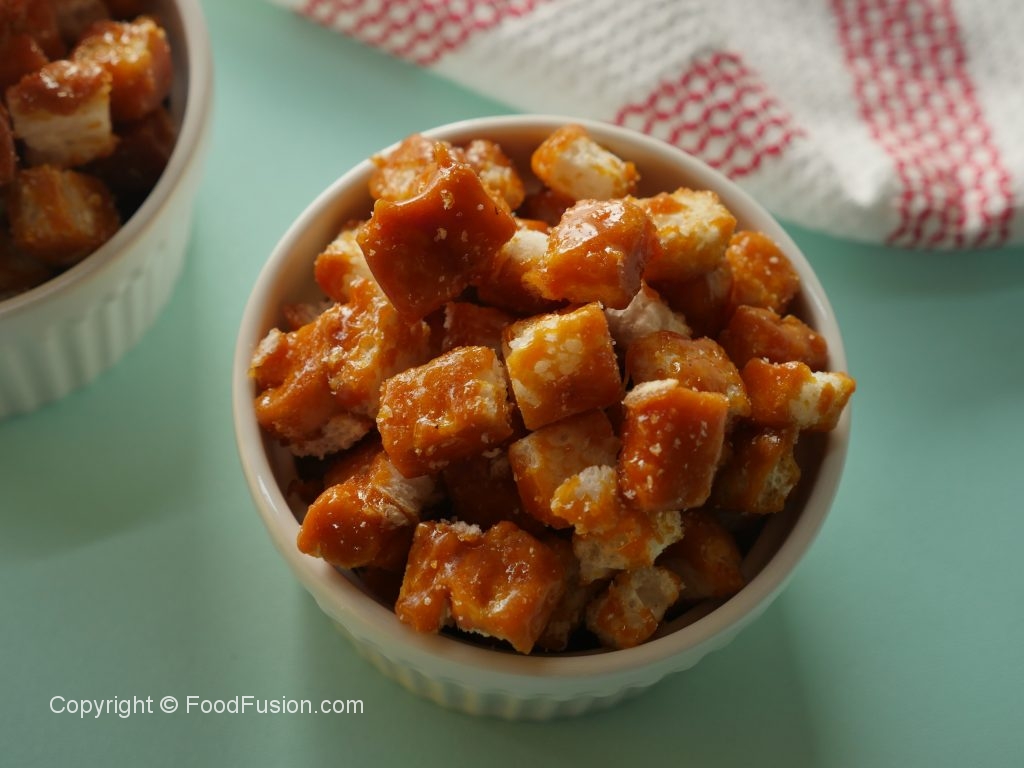 In wok,add bread cubes and toast on low flame until crispy & set aside.