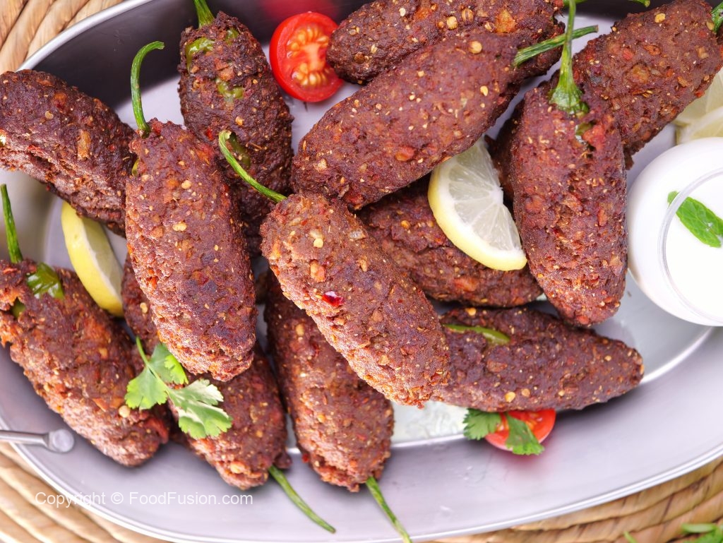 -Take small quantity of chapli kabab mixture & flatten it on your palm,place stuffed green chilli in the center & coat evenly.