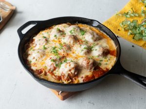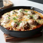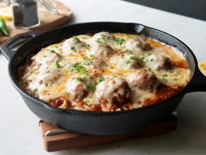 Add prepared meatballs with sauce,add cheddar cheese,mozzarella cheese & red chilli crushed,cover & cook on low flame until cheese melts (4-5 minutes).