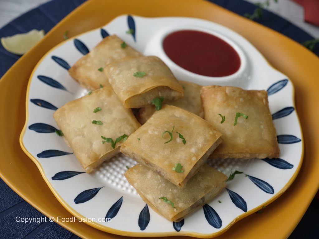 Samosa sheet/manda patti ko four equal parts/strips mein cut ker lein,ek samosa patti ko horizontal rakh dein,maida ki slurry laga phir us ka upper dosri samosa patti vertical rakh dein,plus (+) ka sign bun jaye.