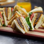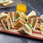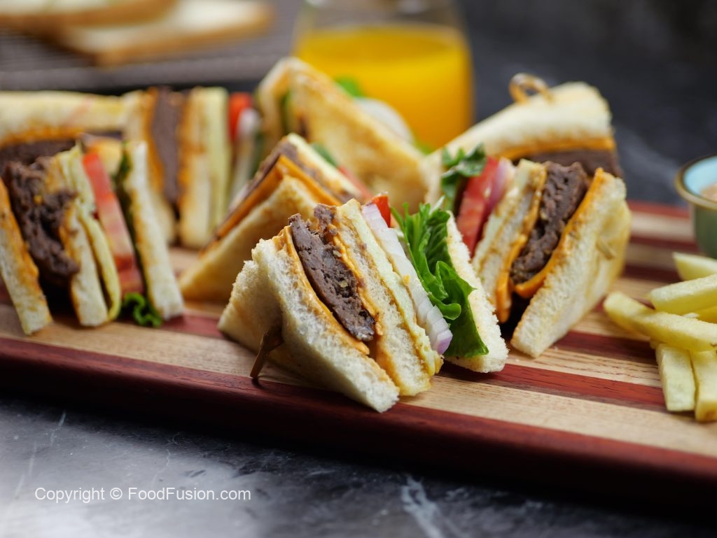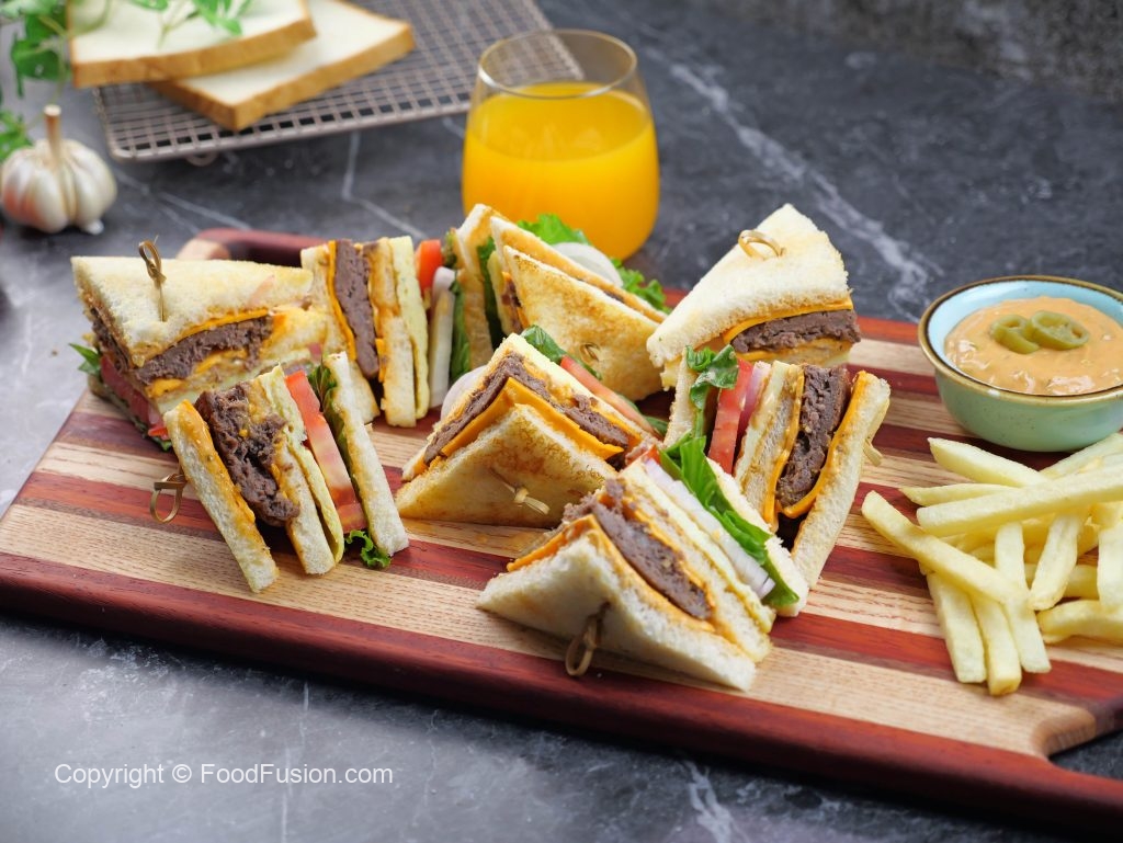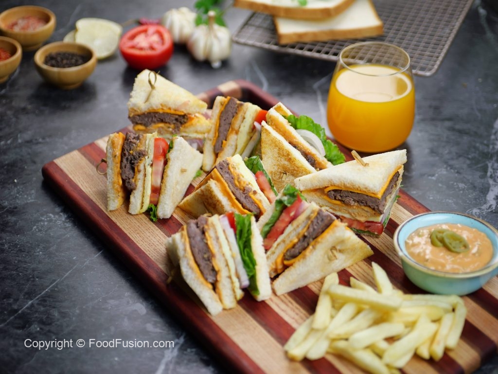 -Uske upar doosra bread slice, cheese slice aur patty with cheese rakhein, phir teesra bread slice se cover karein.