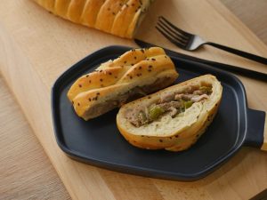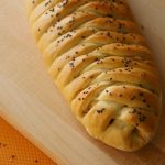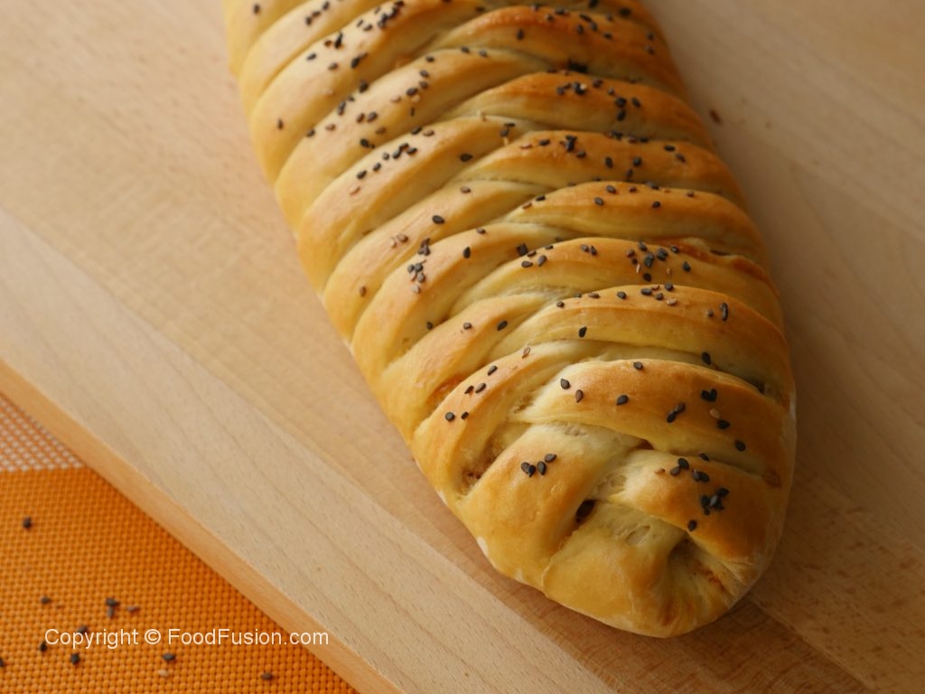 Brush ki madad sa anda+doodh ko braided bread per laga lein aur kalay til chirak lein.