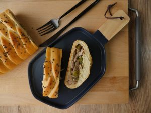 Add cooked beef stuffing in the centre,mozzarella cheese,cheddar cheese and jalapenos.
