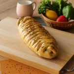 Braid ki tarhan overlap kertay hoye bread ka cuts ko alternately bundd kertay jayein (makes 2).