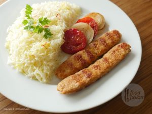 Serve chelo kebabs with butter rice,onion and tomatoes.