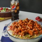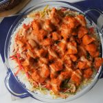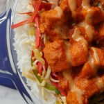 In serving dish,add boiled rice,red chili+garlic tadka,cooked vegetables,cooked tandoori chicken and drizzle prepared sauce & serve!