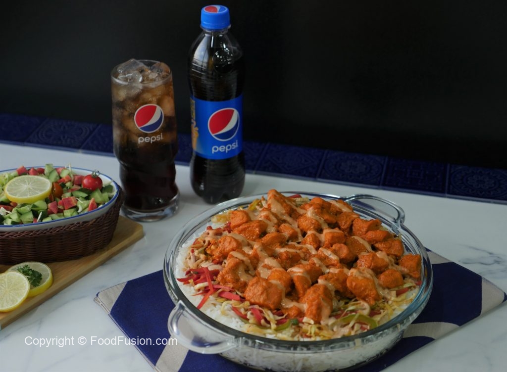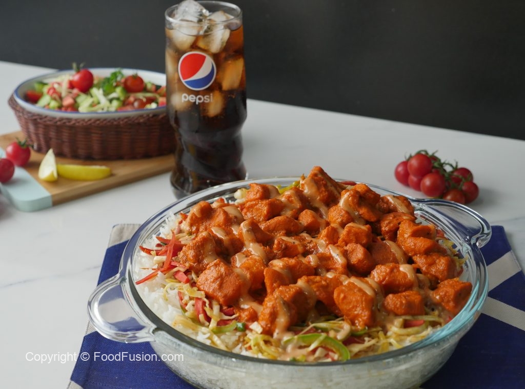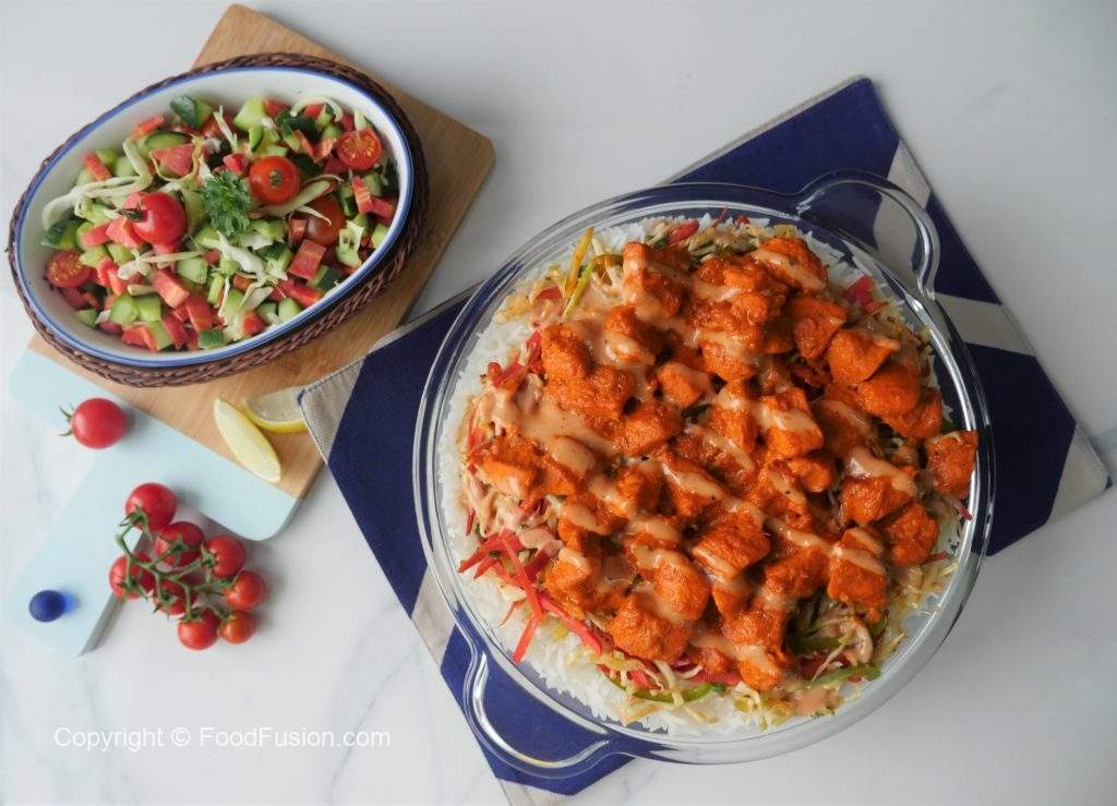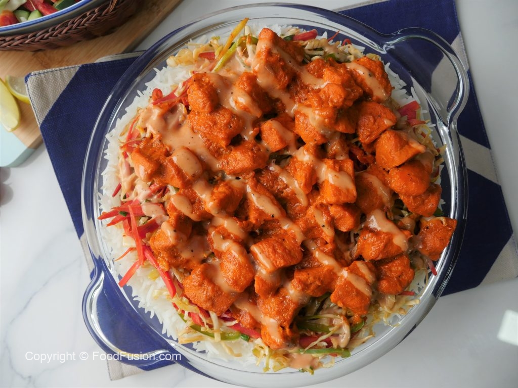 Serving dish mein boiled chawal,lal mirch+lehsan ka tadka,cooked vegetables,cooked tandoori chicken aur tayyar sauce drizzle ker ka serve karein.