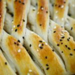 Put dough in a baking tray, apply egg-wash,sprinkle nigella and sesame seeds then bake in a preheated oven at 180 C for about 20-25 minutes.