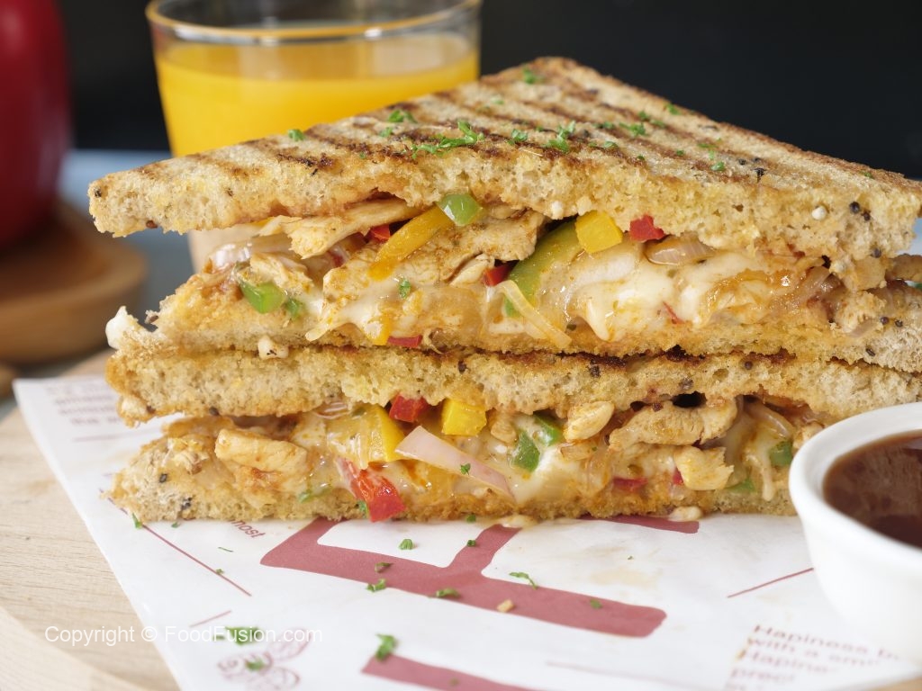 On both bread slices,drizzle tomato ketchup and add prepared chicken fajita filling on one bread slice.
