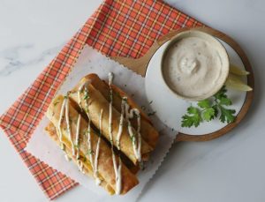 On corn tortilla,add cheese mixture,chicken fries and roll up each tortilla tightly and secure with a toothpick.