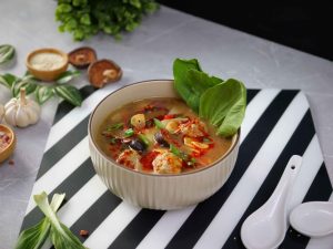 -Serving bowl mein wonton soup daal kar upar se bok choy leaves, chilli oil, spring onion leaves aur fried garlic daal kar serve karein.