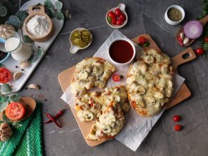 -Add & spread pizza sauce,add cooked chicken,onion,tomato,pickled jalapenos,mozzarella cheese,cheddar cheese,dried oregano & red chilli crushed (makes 6).