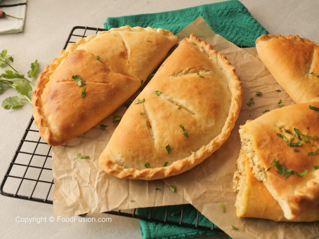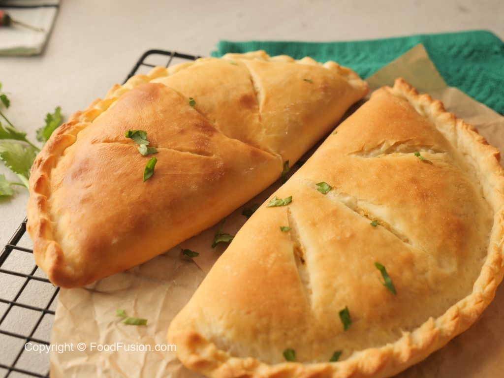 -Baking tray (greased with cooking oil and lined with butter paper) per rolled dough rakh dein,dough ki ek side per chicken filling dal dein,edges per pani laga lein aur dosri side ko fold ker lein,press ker ka pani laga lein aur edges ko seal ker lein.