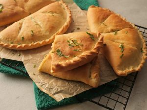 -On baking try (greased with cooking oil and lined with butter paper),place rolled dough,on half side of the dough,add chicken filling,apply water and fold the other side over it,press and apply water and seal the edges.