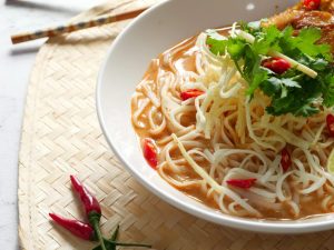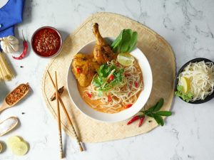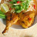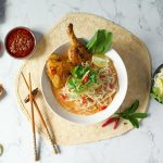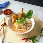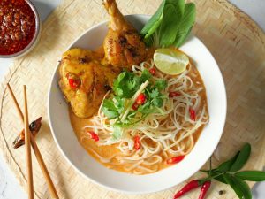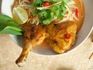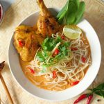 -In a serving bowl,add boiled egg noodles,cooked chicken,cooked curry,crispy egg noodles,bok choy leaves, lemon,fresh coriander,ginger,thai red chilli & serve!
