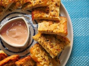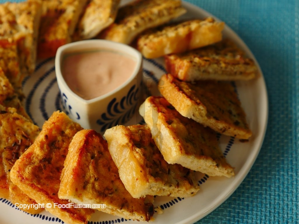 Spread prepared chicken mince on bread slices, sprinkle cumin seeds and press slightly.