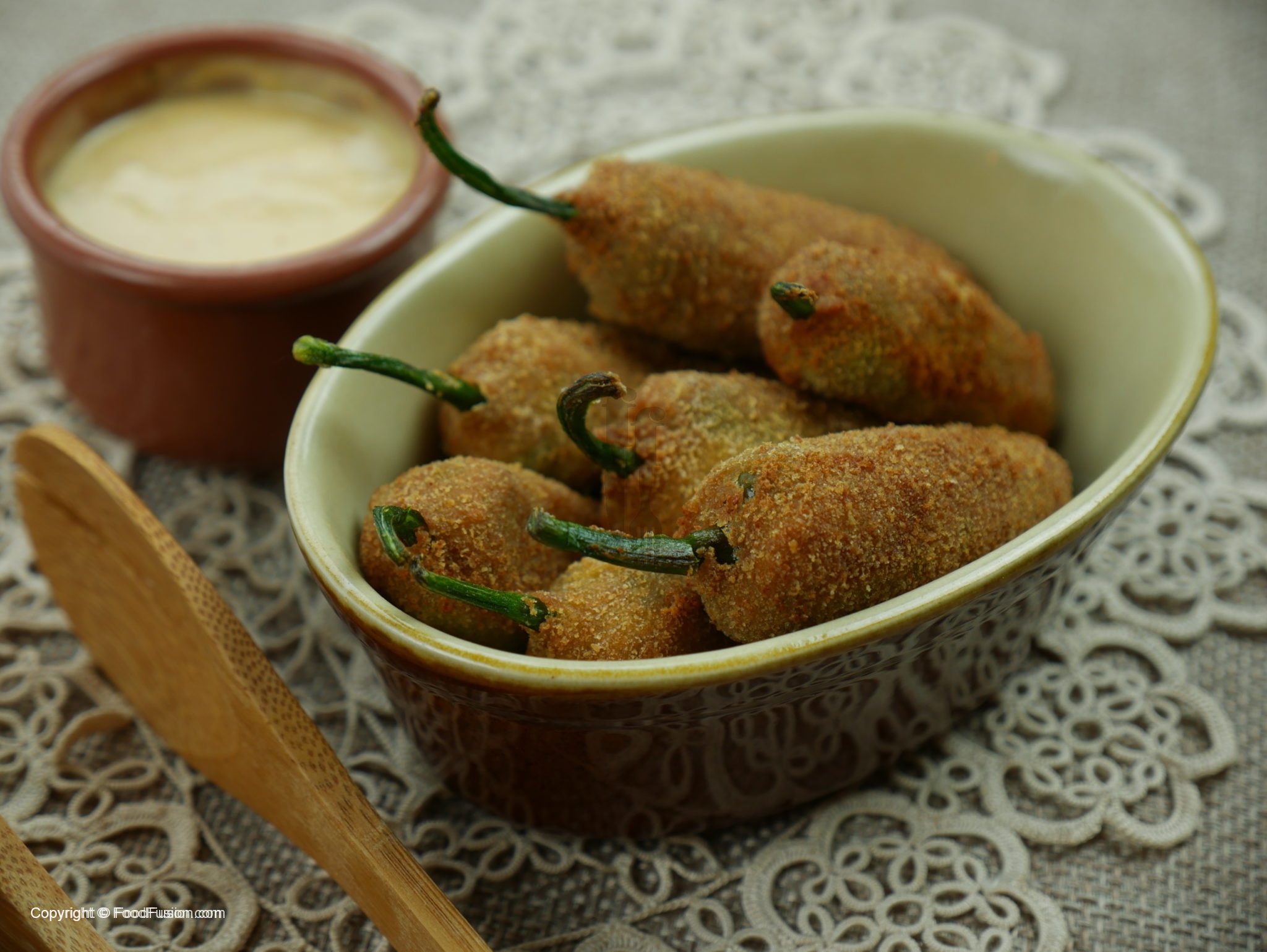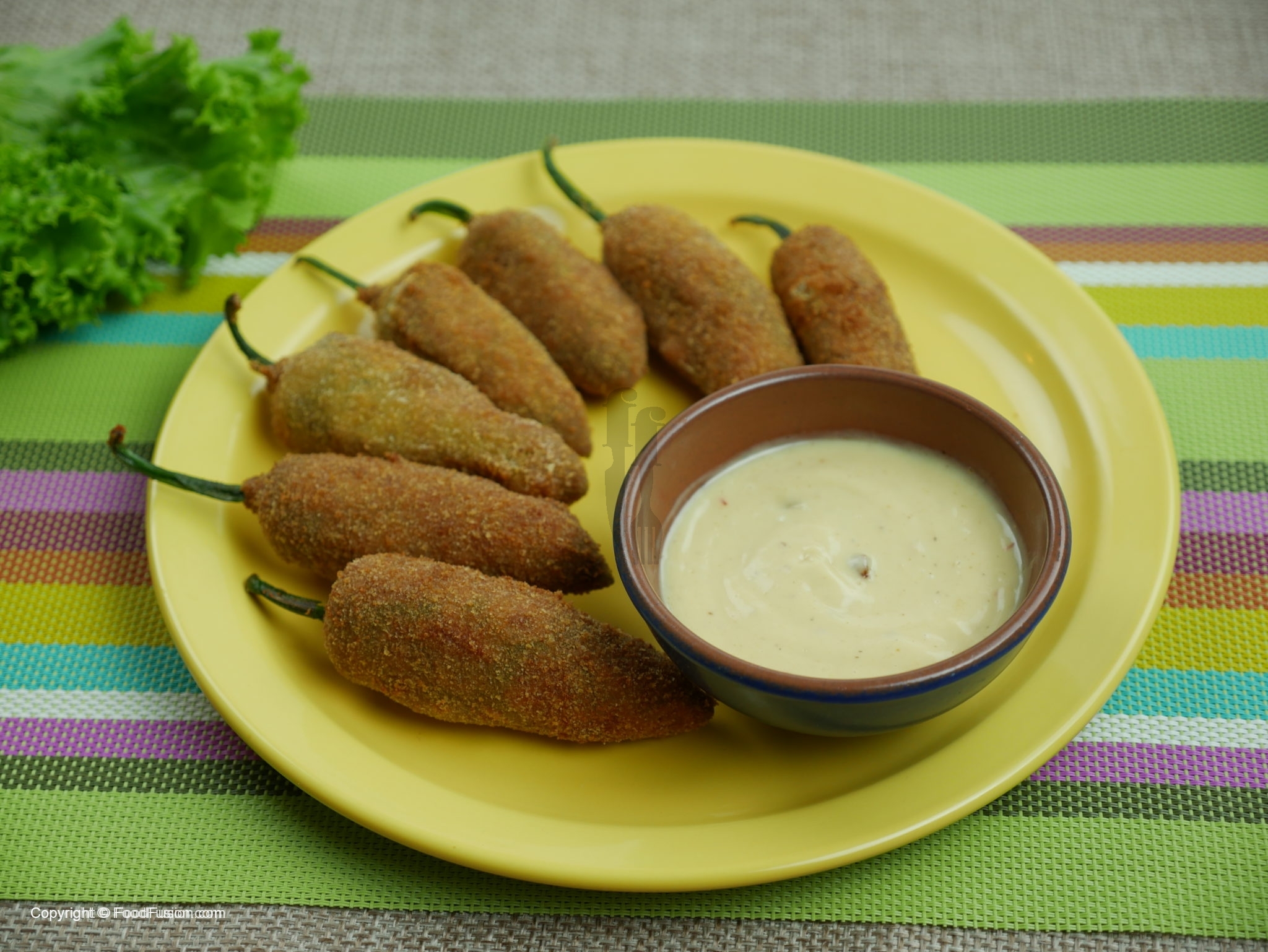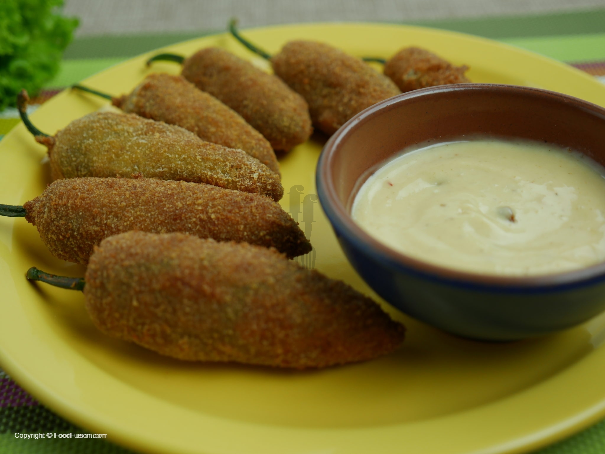 Take out chilies from water and pat dry them. Put a chicken slice and cheese inside the chilies and set aside.