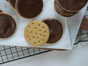 -Biscuits ki ek side per melted chocolate laga lein aur room temperature per set ho janay tak chor dein (makes 28).