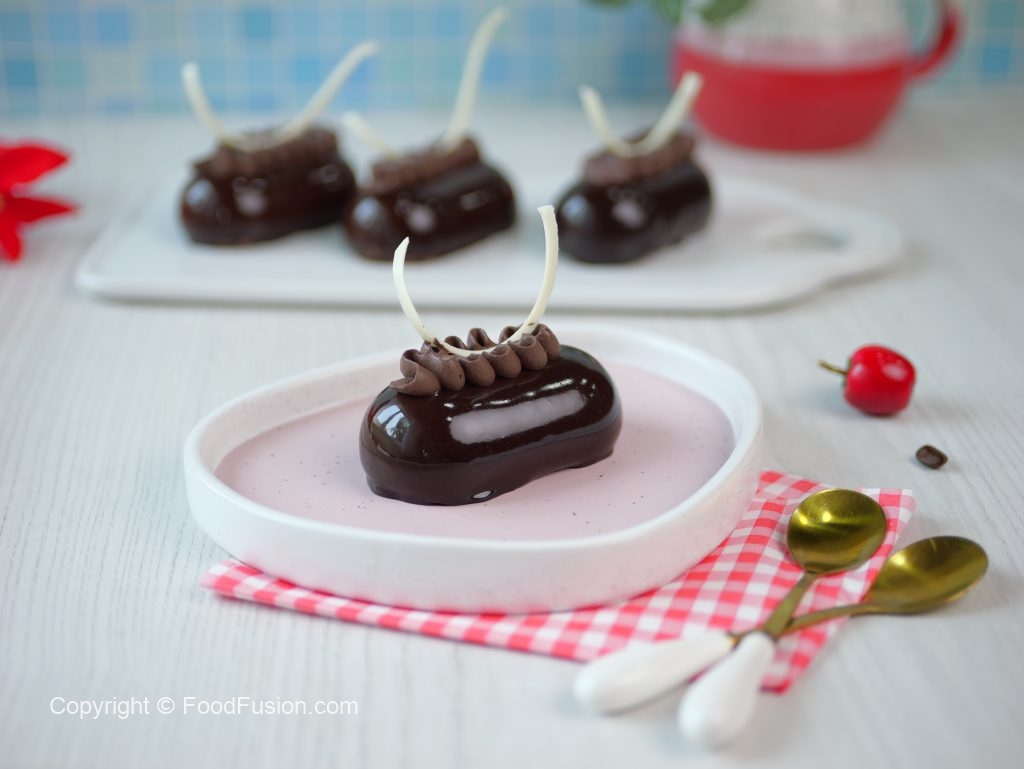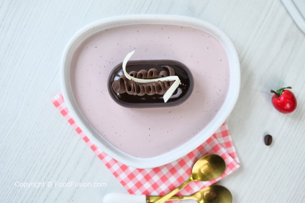 -Pipe out the chocolate mocha mousse in oval shape silicone cake mold,spread evenly & place a thin layer of sponge cake,press gently & freeze for 6 hours or overnight in freezer.