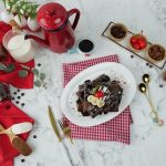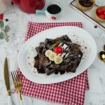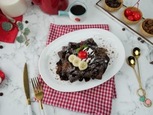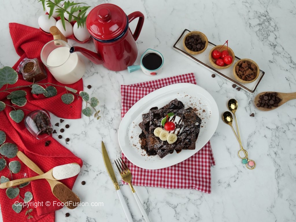 -On chocolate waffles,pour prepared chocolate sauce,cookie crumbs,olper’s whipped cream,chocolate chips, icing sugar & garnish with banana slices,cherry & mint leaves.