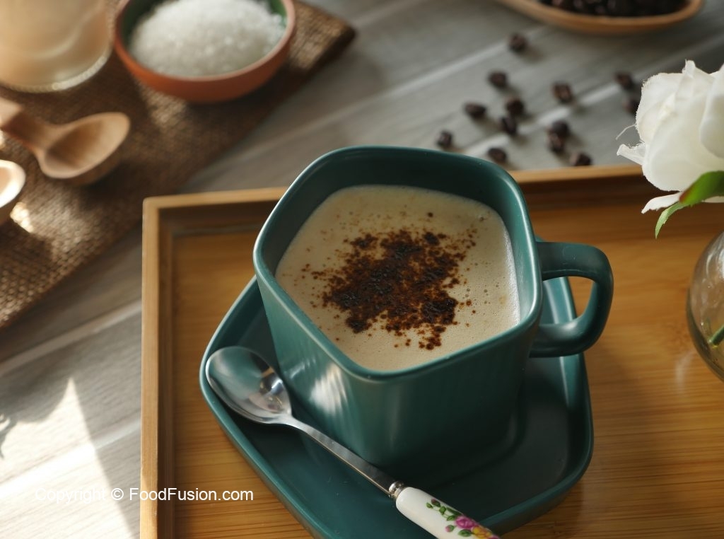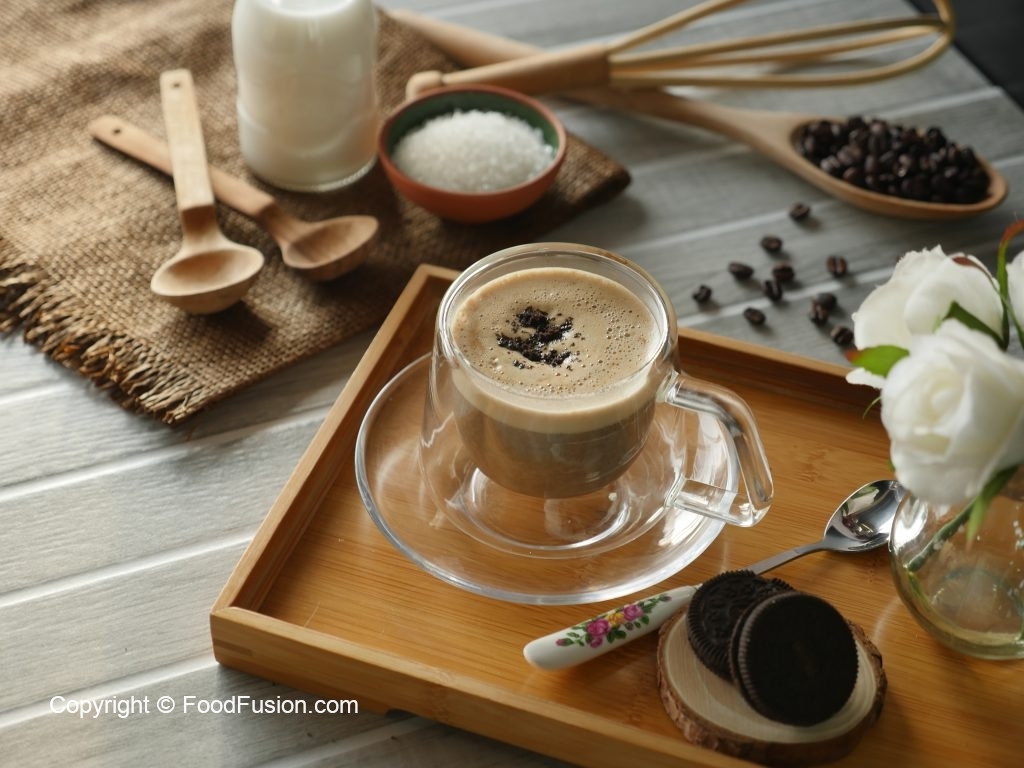 1-2 tbs tayyar coffee base dal ker frothy hunay tak ache tarhan whisk ker lein.