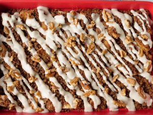 Tayyar cream sauce ko drizzle ker ka akhrot dal dein.