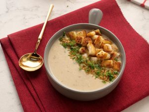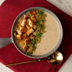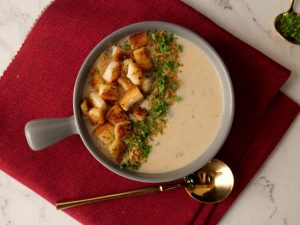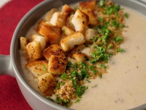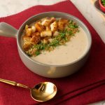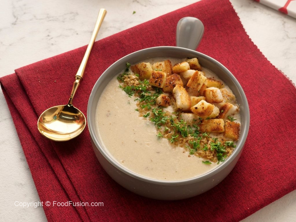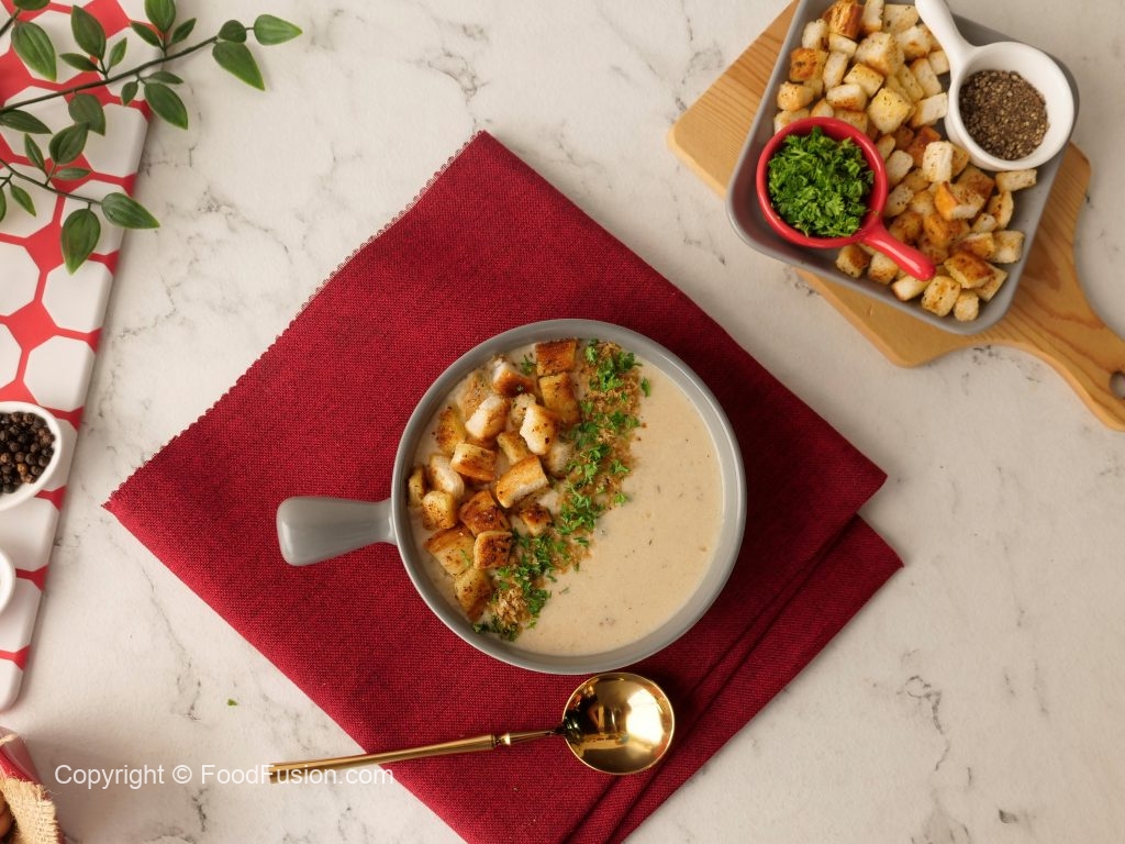 A perfect soup recipe to warm you up this winter season. Cream of Chicken Soup recipe with Crispy Garlic Croutons to go with it #HappyCookingToYou #FoodFusion #OlpersCream