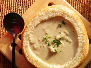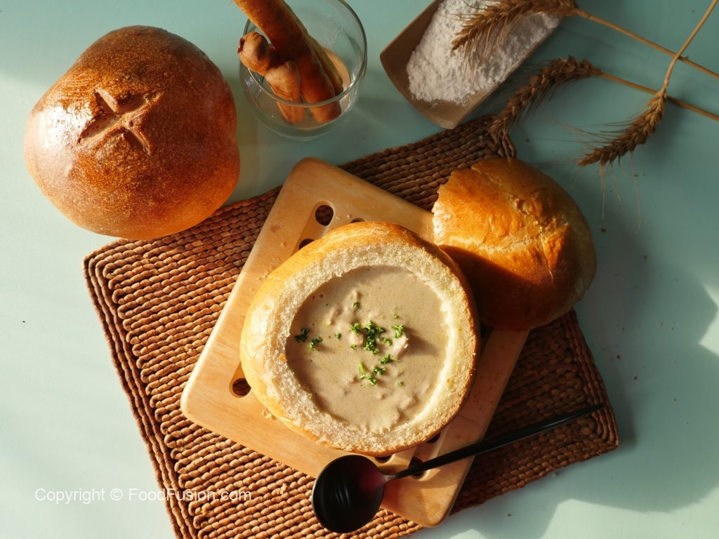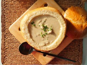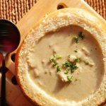 Let the bread cool down and using a knife to cut a circle out of the top of the bowls.Use a spoon to scoop out some of the extra bread so that you have enough room in the bowl for soup and reserve the bread for dipping.