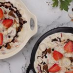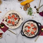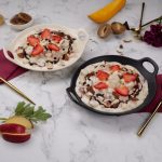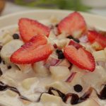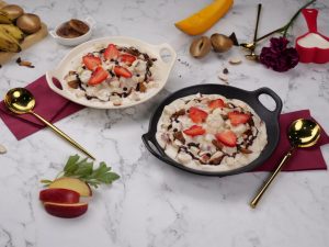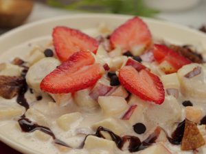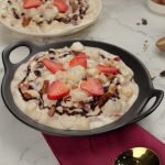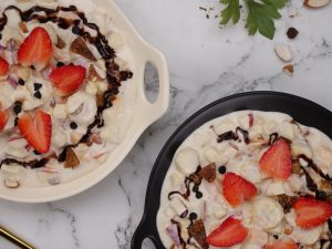 -In serving plate,add creamy fruit chaat,dried figs,almonds,chocolate ganache,creamy fruit chaat, chocolate chips,garnish with strawberry & serve!
