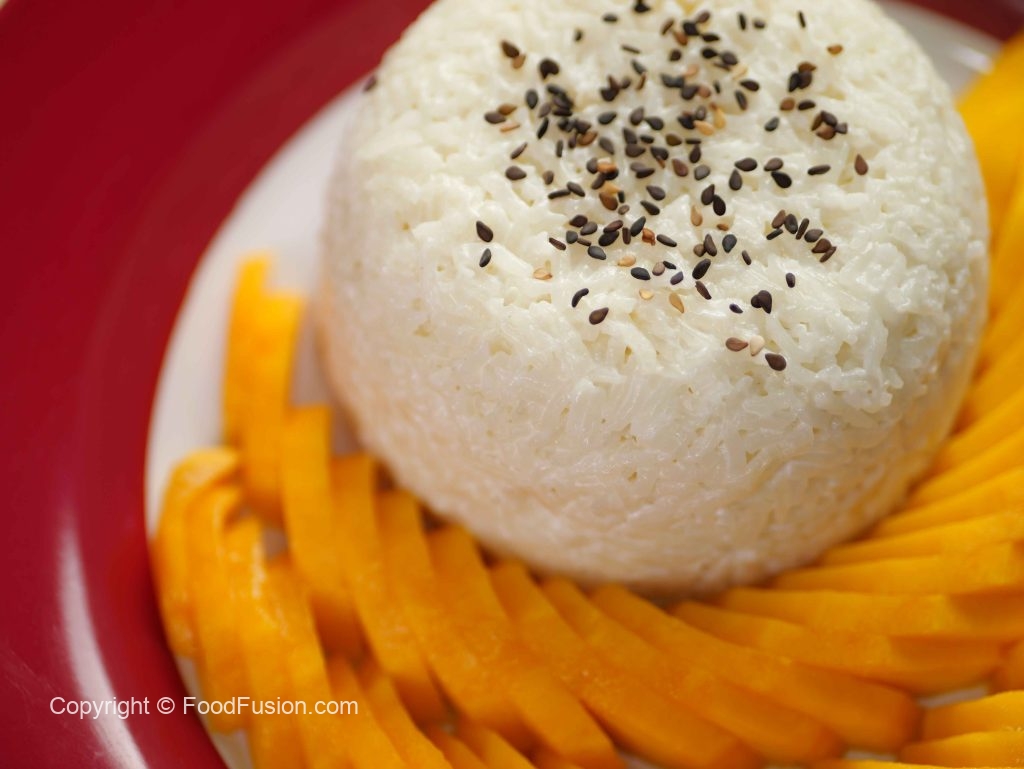 -In a serving plate,place sticky rice,mango slices,black sesame seeds,pour creamy coconut sauce & serve!