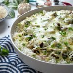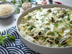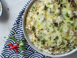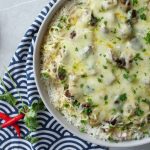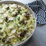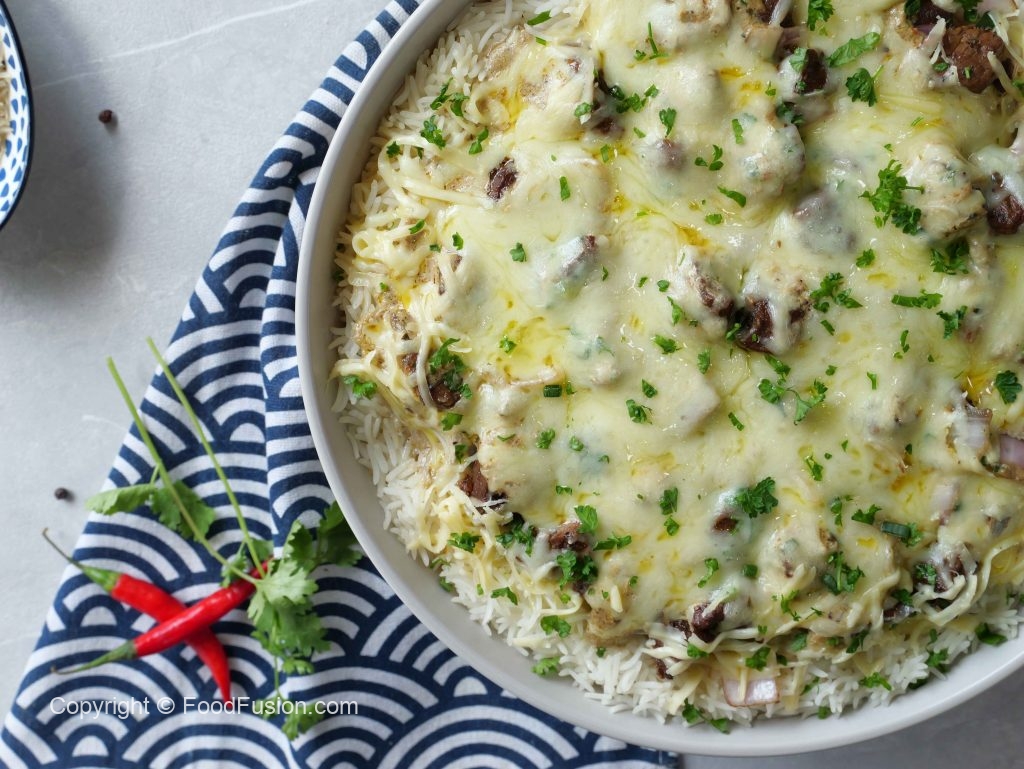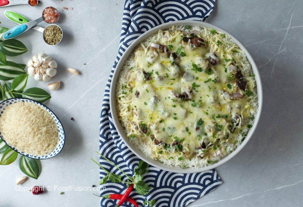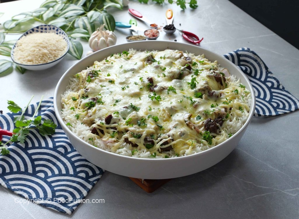 -In a serving dish,add boiled rice,steak bites,fresh parsley,spring onion,pour prepared white sauce, cheddar cheese & mozzarella cheese.