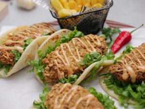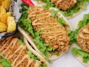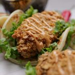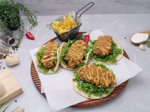 -On a flat bread,add lettuce leaves,crispy chicken slider,drizzle spicy mayo sauce & serve (makes 4)!