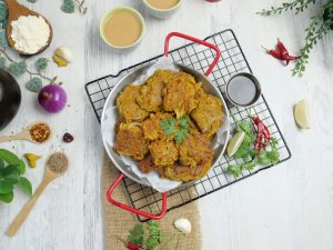 -Bowl mein pyaz,zeera powder,lal mirch powder,chaat masala,haldi powder,sabut dhania, baking powder,ajwain,namak,hari mirch aur hara dhania dal ker ache tarhan mix ker lein.