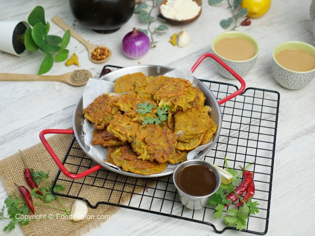-On a griddle,add cooking oil,onion pakora batter & tawa fry on medium low flame from both sides until golden brown & crispy.
