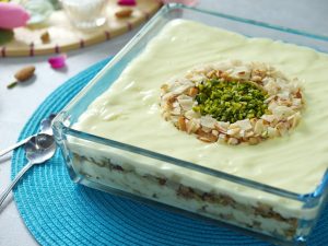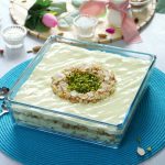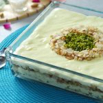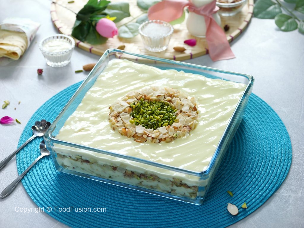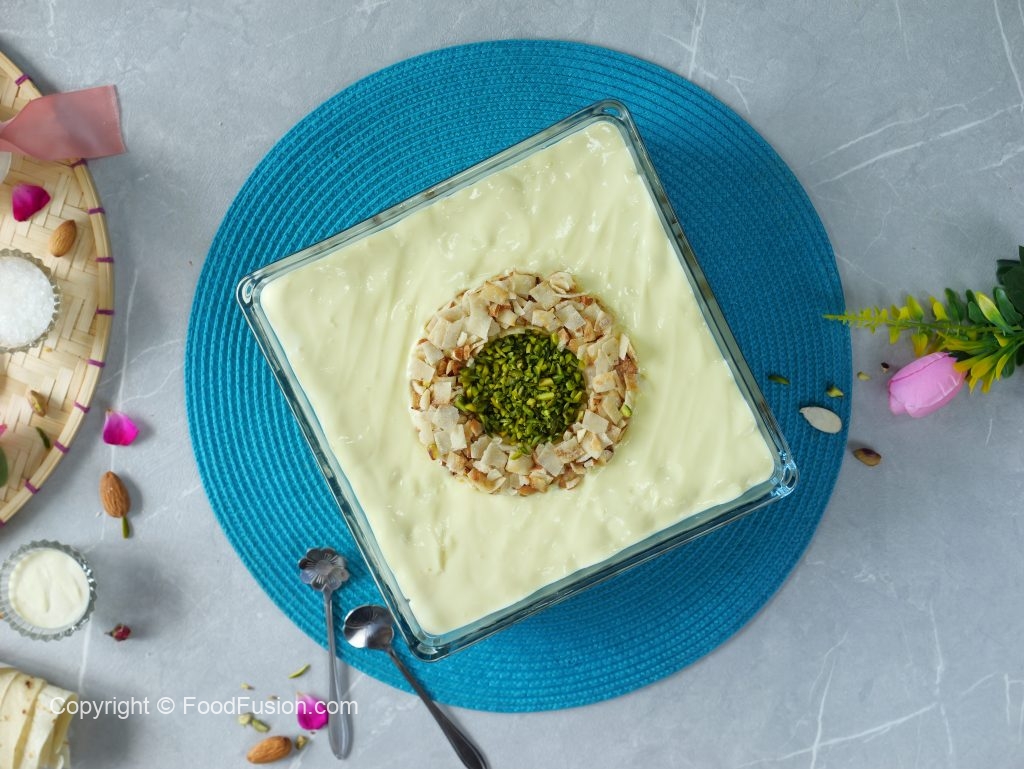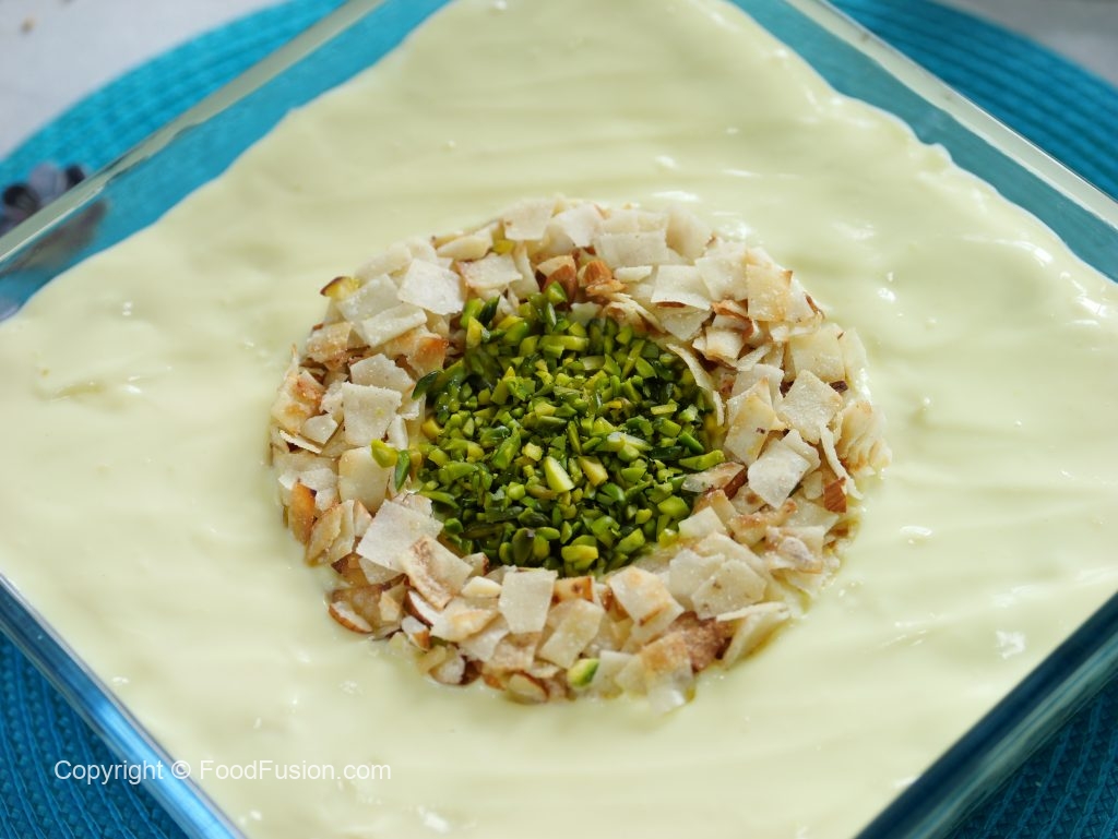 -In a serving dish,add prepared custard,fried samosa patti mixture,prepared custard,fried samosa patti mixture,prepared custard & garnish with fried samosa patti mixture & pistachios.