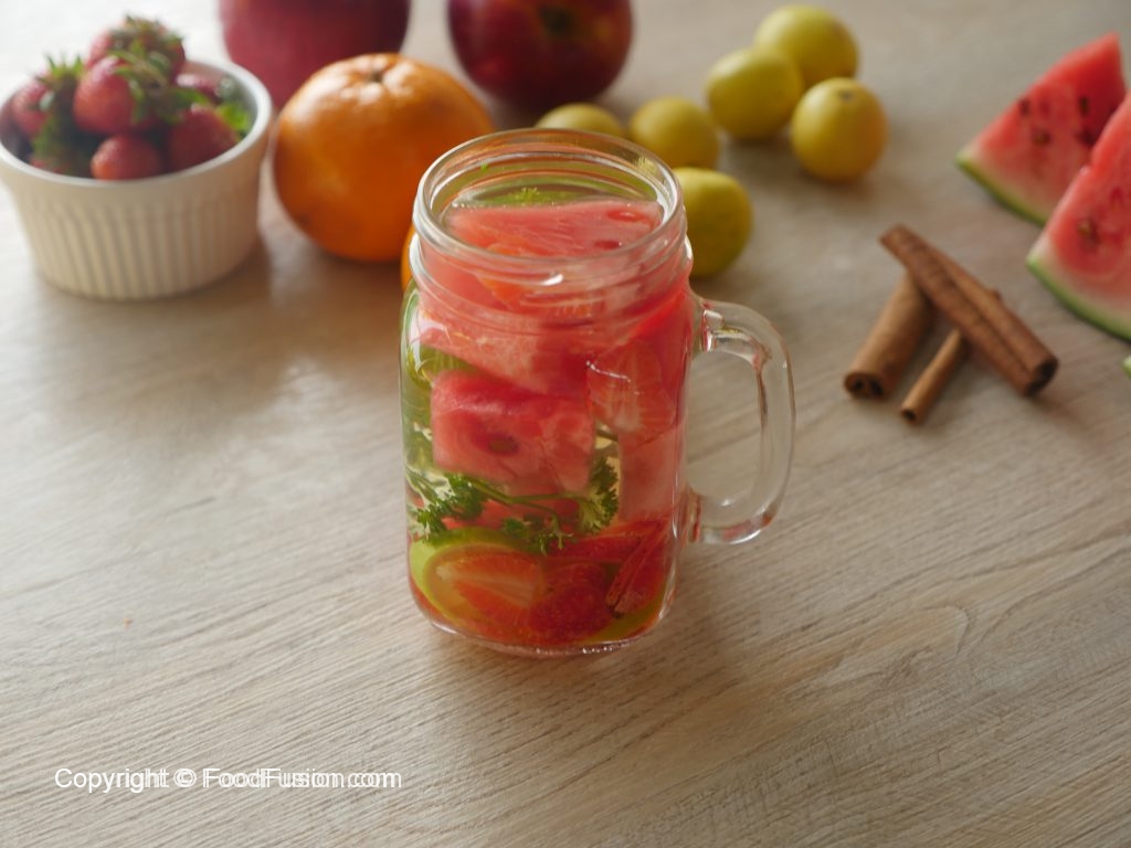In jug,add strawberries,grape fruit,orange,kiwi,mint leaves,apple cider vinegar and cold water,stir & cover.