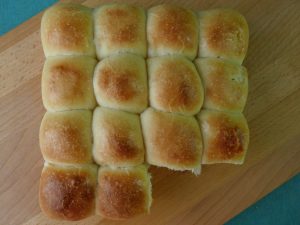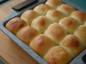 Grease 8 x 8” square baking pan with melted butter and place small balls of dough.